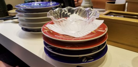 In general, at kaiten sushi, the different colors of plates indicate different prices. It is usually 3,4 different colors of plates that are rotating so it’s not that hard to keep a track of the price. You also keep all your plates at your table where you eat so that staff can count the number of plates at the end to calculate the cost.